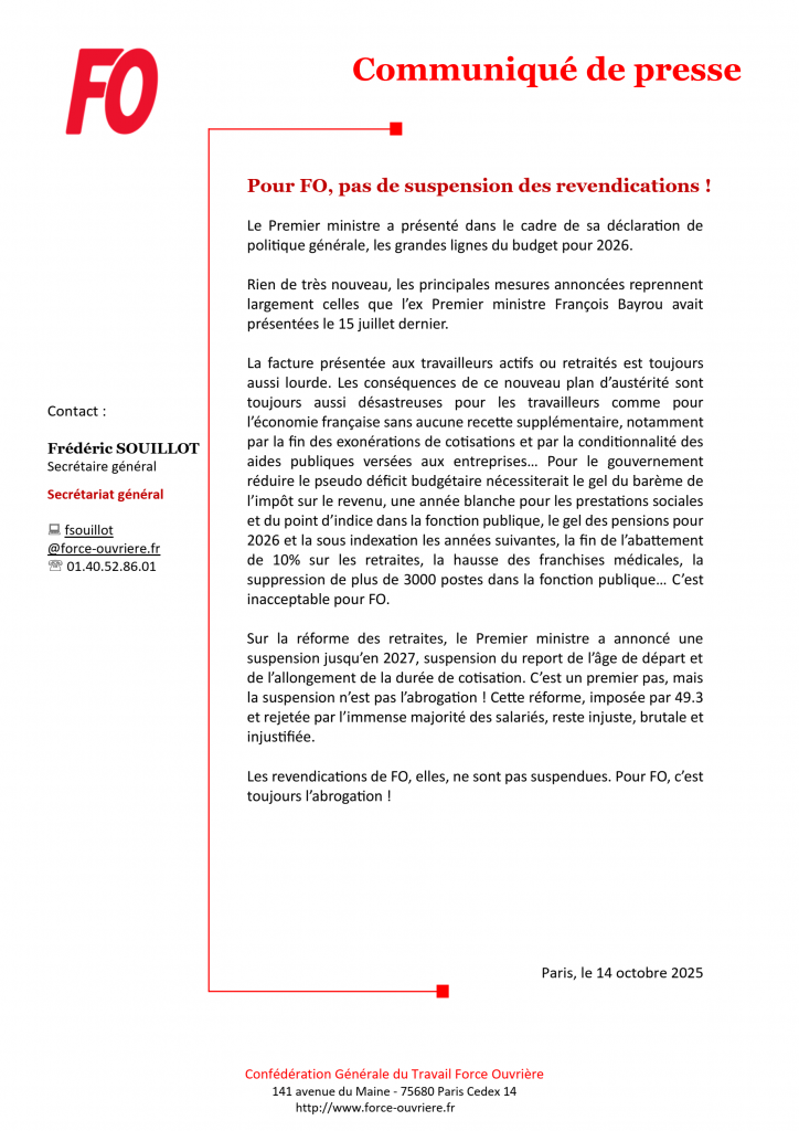 Actualités Communiqué de presse : Pour FO, pas de suspension des revendications ! Les revendications de FO, elles, ne sont pas suspendues. Pour FO, c’est toujours l’abrogation !