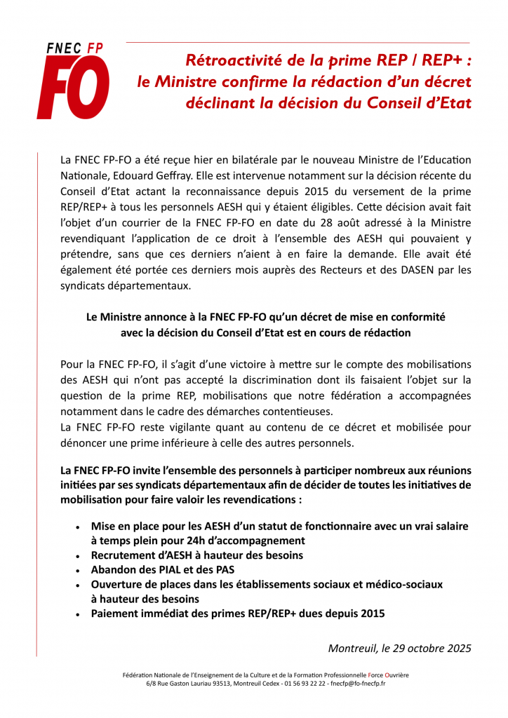 Pour la FNEC FP-FO, il s’agit d’une victoire à mettre sur le compte des mobilisations des AESH qui n’ont pas accepté la discrimination dont ils faisaient l’objet sur la question de la prime REP, mobilisations que notre fédération a accompagnées notamment dans le cadre des démarches contentieuses.