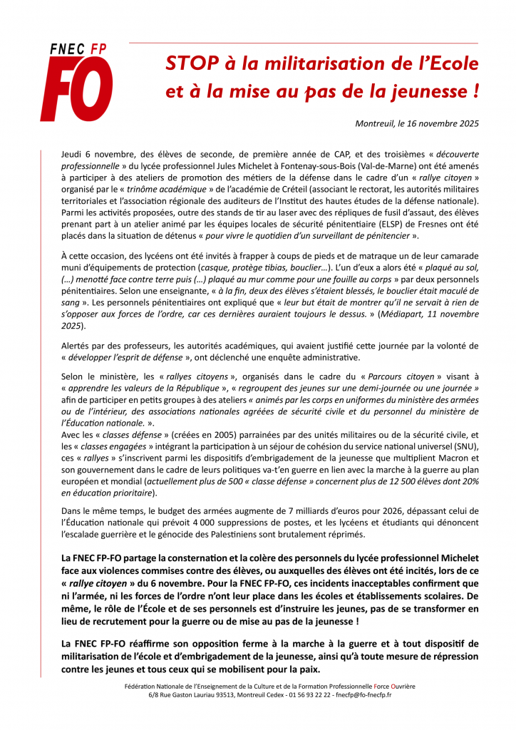 La FNEC FP-FO réaffirme son opposition ferme à la marche à la guerre et à tout dispositif de militarisation de l’école et d’embrigadement de la jeunesse, ainsi qu’à toute mesure de répression contre les jeunes et tous ceux qui se mobilisent pour la paix.