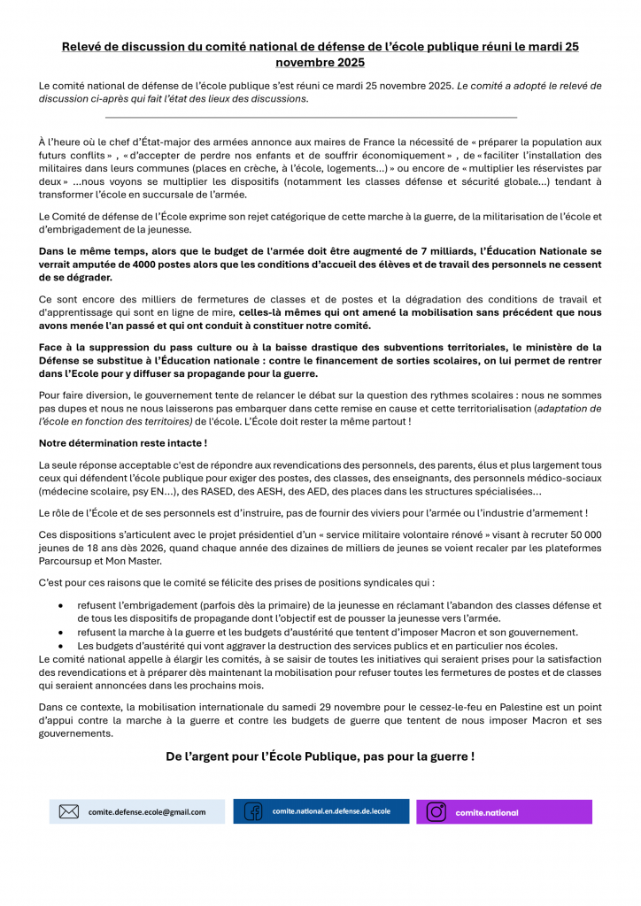 Le Comité de défense de l’École exprime son rejet catégorique de cette marche à la guerre, de la militarisation de l’école et d’embrigadement de la jeunesse.