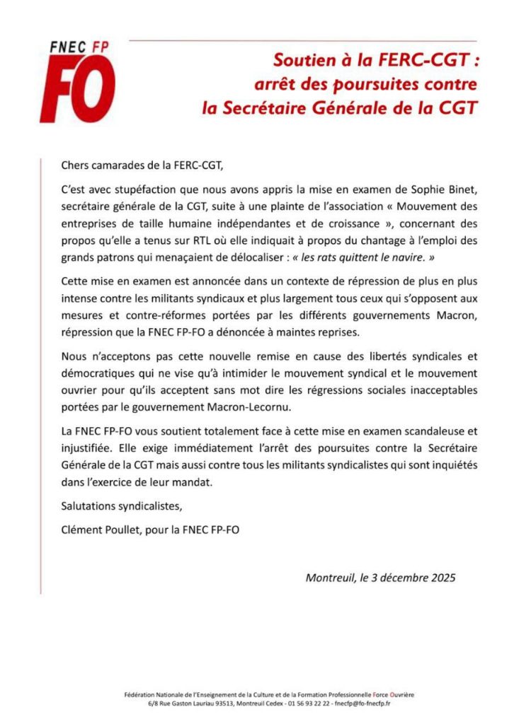 Actualités Soutien à la FERC-CGT : arrêt des poursuites contre la Secrétaire Générale de la CGT Courrier de la FNEC-FP-FO du 3 décembre en soutien à la FERC-CGT