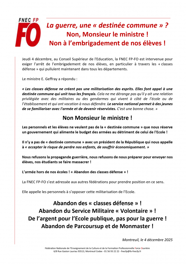 Jeudi 4 décembre, au Conseil Supérieur de l’Education, la FNEC FP-FO est intervenue pour exiger l’arrêt de l’embrigadement de nos élèves, en particulier à travers les « classes défense » qui pullulent maintenant dans tous les départements.