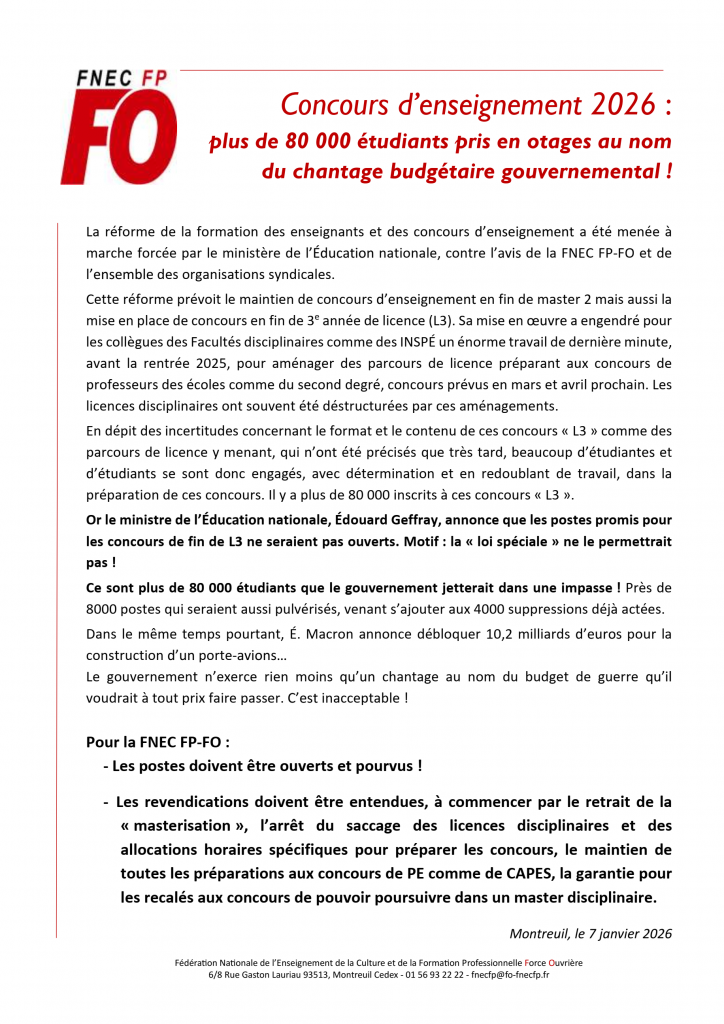Or le ministre de l’Éducation nationale, Édouard Geffray, annonce que les postes promis pour les concours de fin de L3 ne seraient pas ouverts. Motif : la « loi spéciale » ne le permettrait pas ! Ce sont plus de 80 000 étudiants que le gouvernement jetterait dans une impasse ! Près de 8000 postes qui seraient aussi pulvérisés, venant s’ajouter aux 4000 suppressions déjà actées.