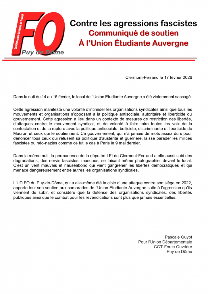 L’UD FO du Puy-de-Dôme, qui a elle-même été la cible d’une attaque contre son siège en 2022, apporte tout son soutien aux camarades de l’Union Etudiante Auvergne suite à l’agression qu’ils viennent de subir, et considère que la défense des organisations syndicales, des libertés publiques ainsi que le combat pour les revendications sont plus que jamais essentielles.